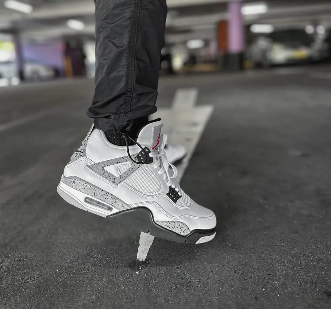 The Nike Air Jordan 4 Retro "White Cement" is an iconic 1989 Tinker Hatfield design, famous for its white leather upper, Tech Grey speckled midsole/wings, and Fire Red accents. The 2025 retro features OG-style "Nike Air" branding on the heel, improved shape, and premium materials, designed to replicate the original.