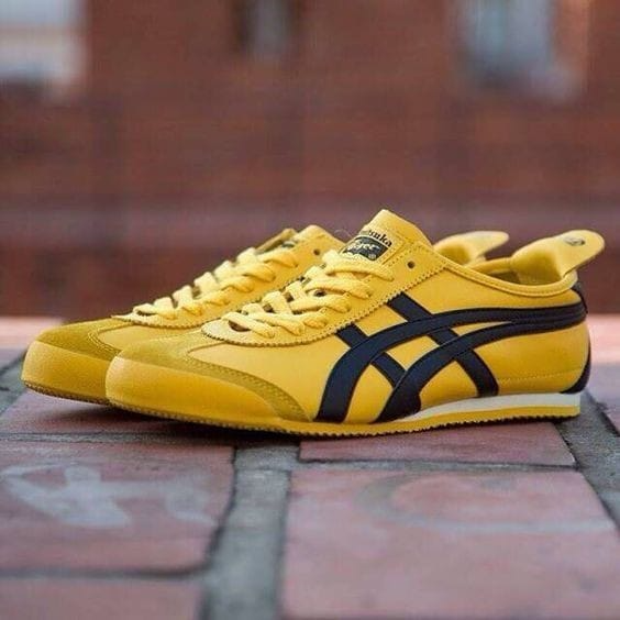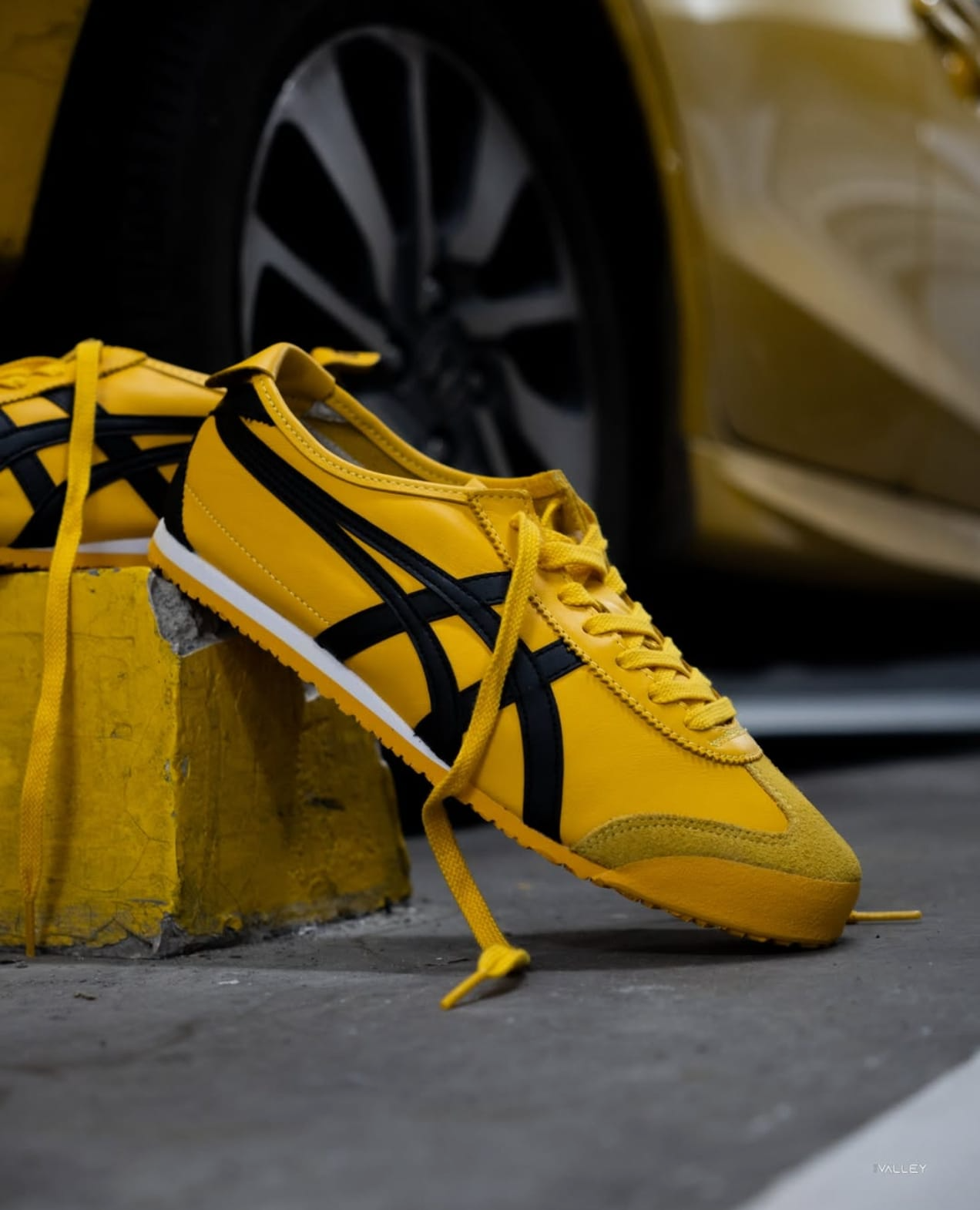 The Onitsuka Tiger Mexico 66 in Yellow/Black is an iconic, unisex low-top sneaker featuring a vibrant yellow leather upper with black tiger stripes, inspired by the 1966 design. It boasts a retro aesthetic with a heel-cross reinforcement, durable rubber sole, and slim silhouette, made famous by Bruce Lee.