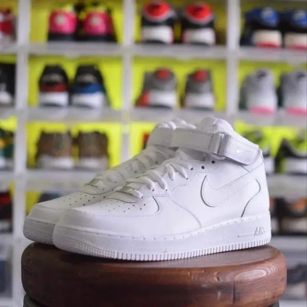 The Nike Air Force 1 Mid in white is a classic, versatile sneaker featuring a crisp, monochromatic design with a mid-cut, padded collar for ankle support. Built with a durable white leather upper, it includes a perforated toe box for breathability, a cushioned foam midsole with encapsulated Nike Air units, and a rubber outsole featuring the signature pivot circles.